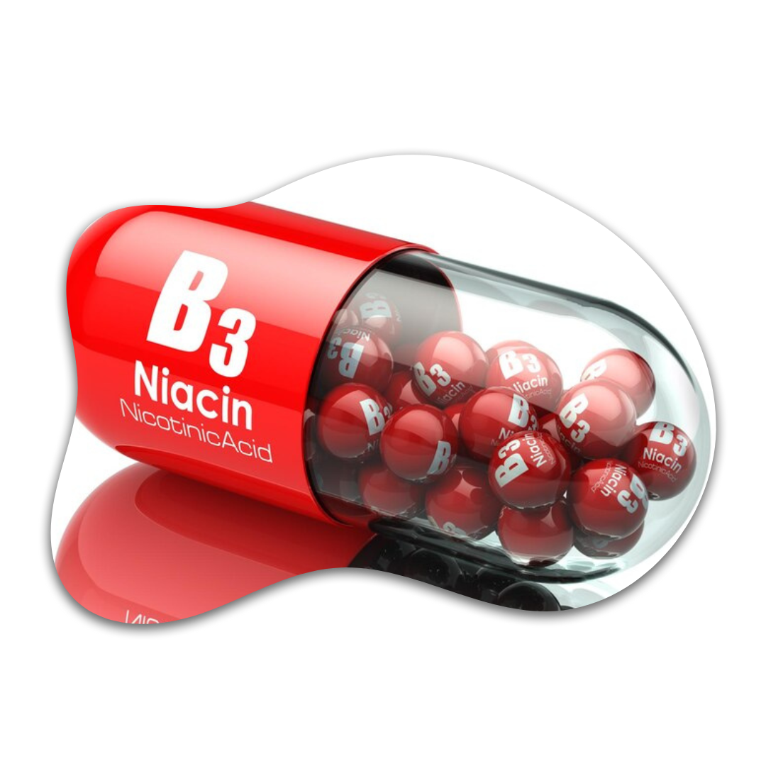 A vitamina B3 (niacina) auxilia no funcionamento do sistema nervoso e na produção de energia celular. Ela também contribui para a redução do cansaço e da fadiga, melhorando o bem-estar físico e mental.