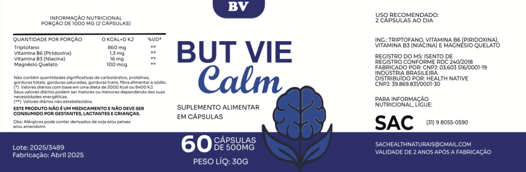 Por se tratar de um Suplemento alimentar seguro para consumo, BUT VIE Calm é um produto dispensado da obrigatoriedade de registro.
